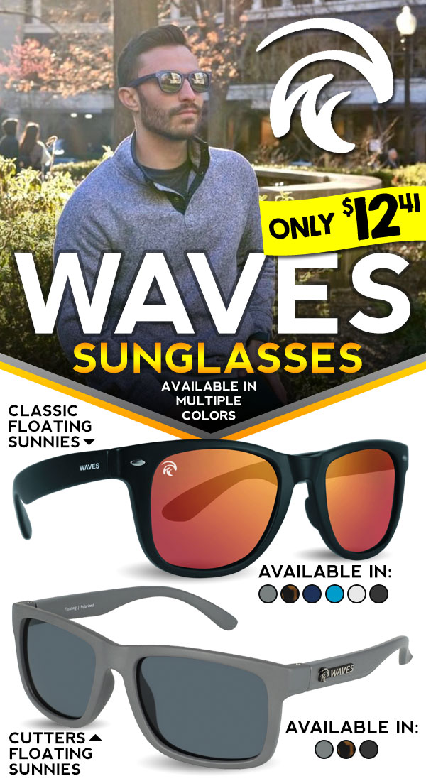 | Just $12.41 for Waves floating polarized sunglasses Anyone who's watched a pair of shades drown in a lake will instantly understand how useful it is to own a pair of the original floating sunglasses. But this is no one-trick pony. They have featherlight yet durable and of course, unsinkable, frames. The lenses are high-quality polarized lenses which eliminate glare from water and reflective surfaces, along with 100% UVA and UVB protection to filter out the sun's harmful rays. Reduced eye fatigue, reduced head pain from all-day wear, reduced glare, more protection. The best part? They're a whooping 70% off! |